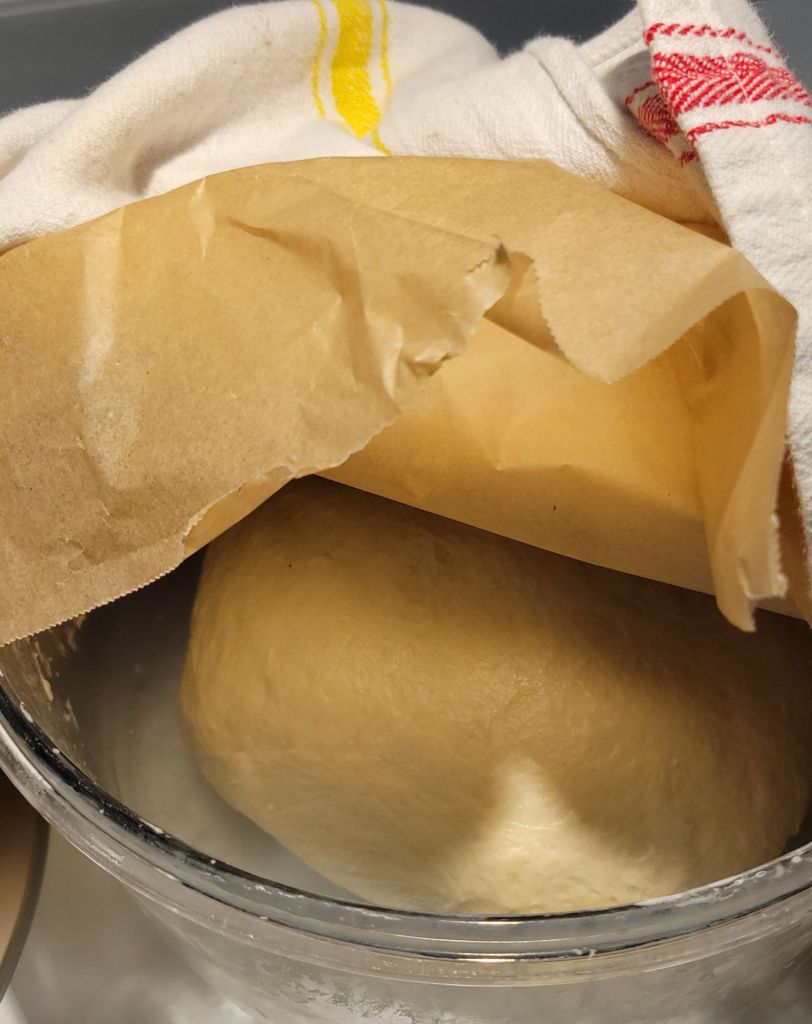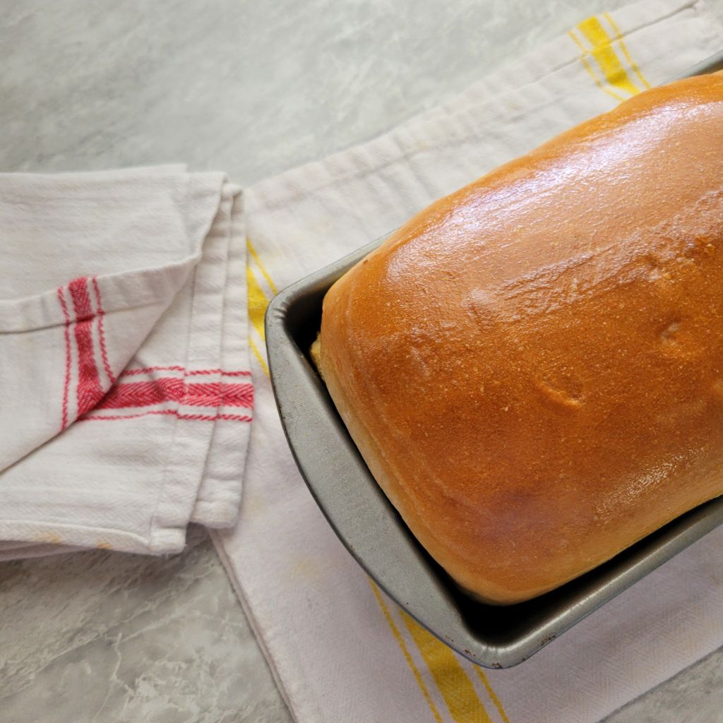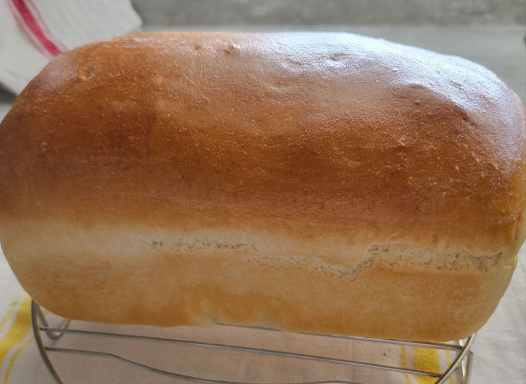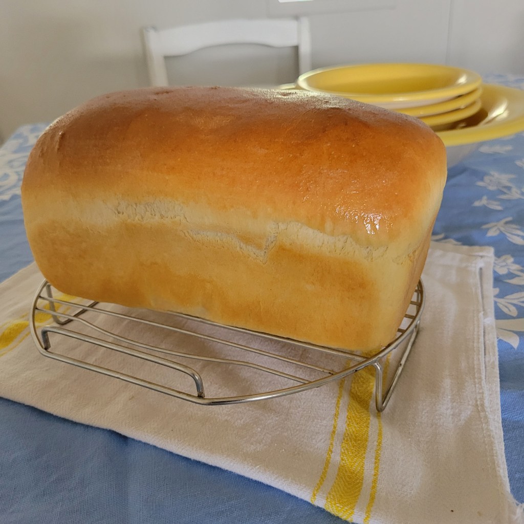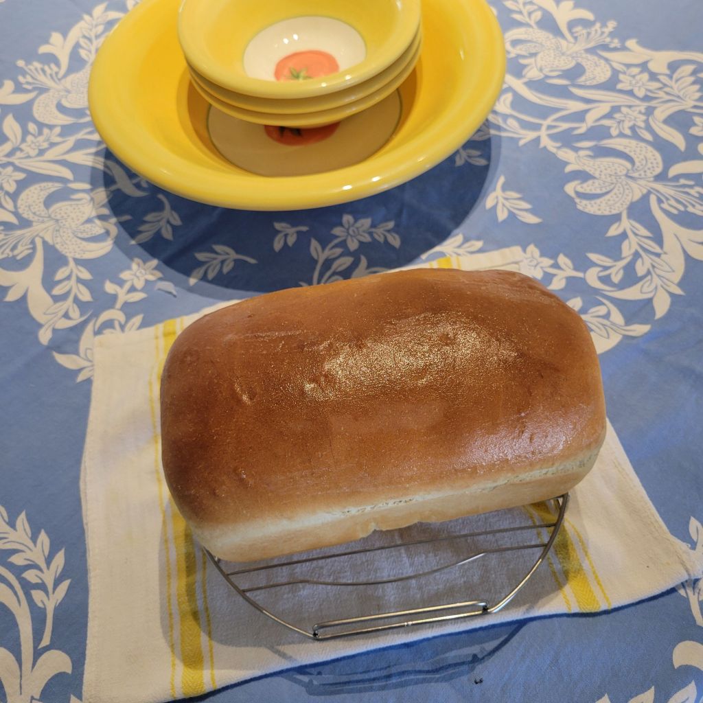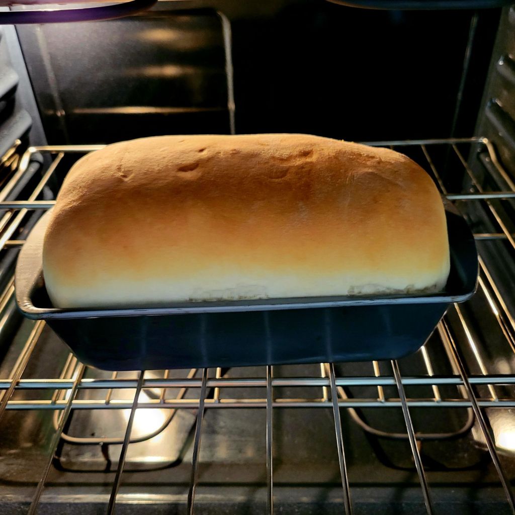 Follow directions at the link on YouTube. It’s really easy. Warm milk, add yeast, salt, and sugar (I let the yeast activate), then stir in oil, then flour. Mix with hands until no dry flour. Tuck under to ball up, cover, and wait 30 minutes. Then fold , turning bowl, about 4 times. Repeat, and go back to fold 4 times, waiting 30 minutes between each time. On last time, cover and let rise an hour (or two, depending on how warm it is in your house). Remove from bowl to lightly floured surface and roll out to a rectangle, the width of your loaf pan. Roll up, tuck ends in. Place in loaf pan that’s been buttered and lined on bottom, although I believe it’d work without preparing pan. Cover and let rise above sides of pan. A couple inches? I covered for half an hour, then left cover off to rise more, because I didn’t want cover to stick to dough and chance breaking dough. I got that from the previous bread recipe I did. Bake in 350Β° oven for about 20-25 minutes, when color is a nice golden brown. You don’t want to over bake it, or it will dry it out more. And… it turned out GOOD! π
