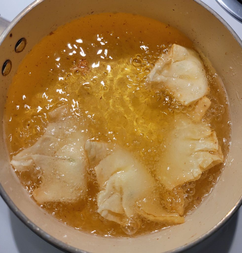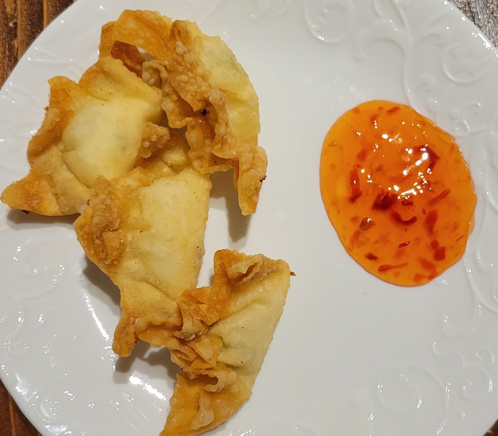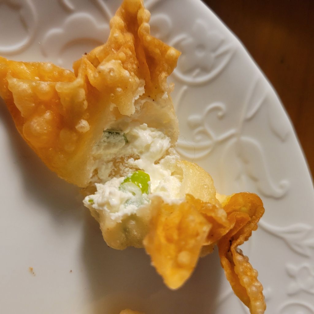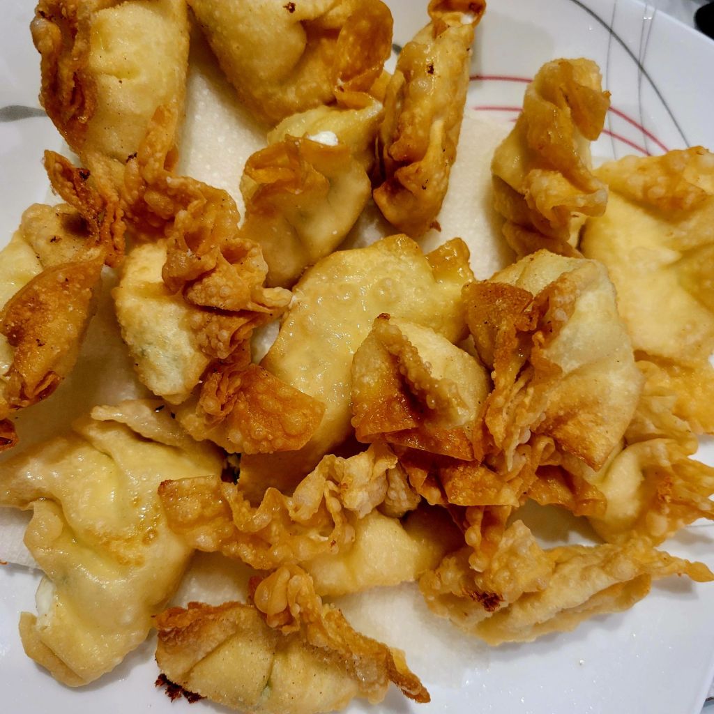 Another easy DELICIOUS thing to make that, imho, doesn’t need a recipe. Finely chopped scallions, green onions, or chives, and stir into cream cheese. I didn’t measure that. It was a scoop… less than a cup. I’ll also say I’ve added crabmeat to this in the past that are really good, too. Wonton wrappers, cream cheese, and scallion. I put about a tbsp of cream cheese mixture in the center of wonton, fold, and sealing edges, whether that be in a fan shape or a purse/bag shape.. they all turn out well. Lay on plate while oil heats. Drop in enough hot oil (med/high) that they float, and fry until desired golden color. Using a spider or spoon with holes, transfer to a paper towel lined plate. Serve with your favorite sweet and sour sauce. This time, we really liked Panda Express Sweet Chili Sauce. We LOVE these! 😍