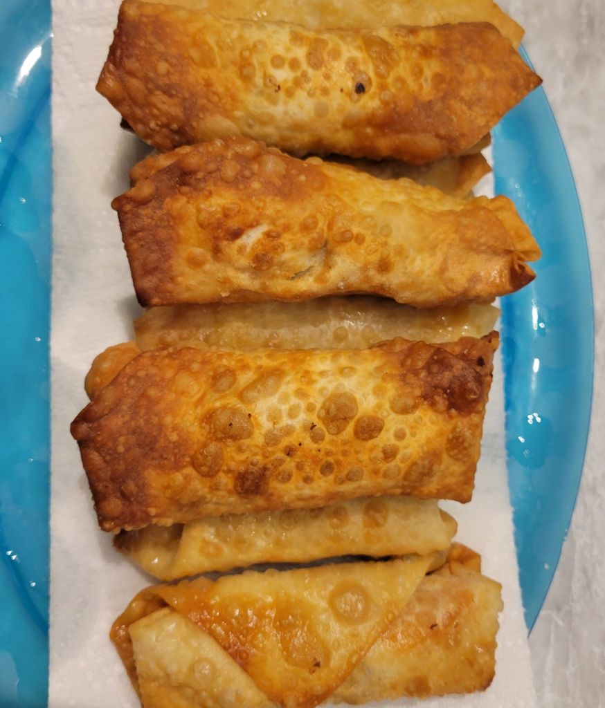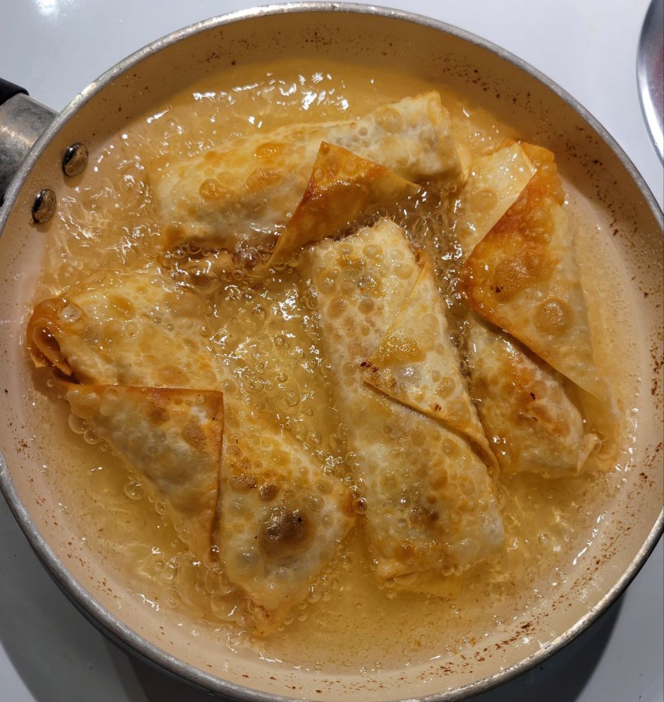 Get egg roll wrappers. Use a little of whatever leftovers you have. I layered some turkey, stuffing, mashed potatoes, and sweet potatoes. It takes very little. Lay out wrapper with a corner pointing toward you. I had a cornstarch/water mixture to put a touch on edges to help seal, but that might not even be necessary. Just sayin π Put ingredients of your choice closer to you, fold point over ingredients, then roll once, fold ends over top, finish rolling. Line up on a plate/platter. Get a pan of healthy oil hot. Fry egg rolls at a medium high heat until desired golden color. Place fried egg rolls on either a cooling rack with paper towels under it or on paper towel lined plate.