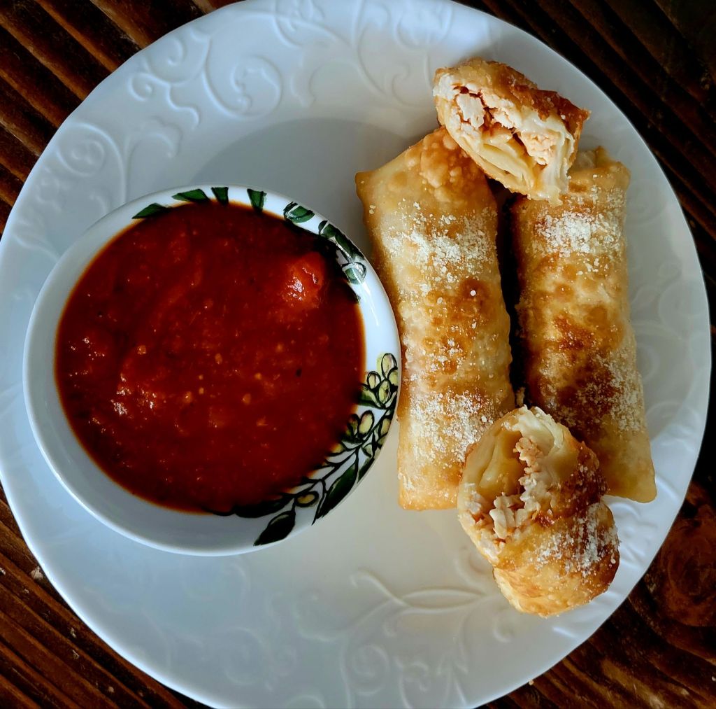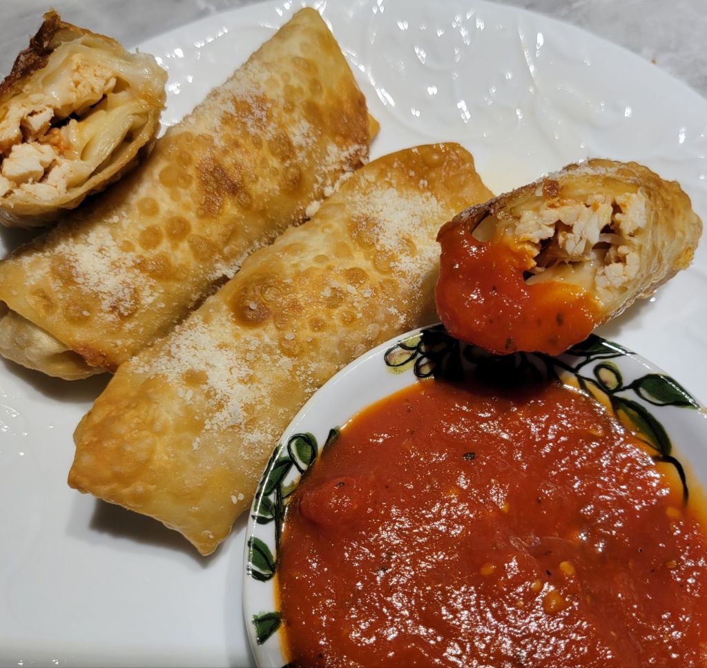 Chicken Parm Egg Rolls, with Marinara Dipping Sauce. π No recipe is needed. For notes regarding rolling, see previous post or check this link out β‘οΈΒ How To Roll Egg Rolls via Instructables π I pressure cooked well seasoned chicken breast. You can use any kind; leftover, rotisserie, or other cooked chicken. Make or heat your favorite marinara sauce. Leave on low. I laid the egg roll wrappers out, with a little water cornstarch mixture nearby. Have mozzarella and parmesan cheese ready. I put shredded mozzarella down first. Then shredded chicken that I stirred a little sauce into on top of mozzarella. Then I put shaved parm on top, rolled, sealing edges with water/cornstarch mixture. Placed them seam side down on a plate. Then heated oil on med/high heat until hot. Dropped filled egg rolls in oil, flipping, once first side is golden to desired doneness. Then, transfer to plate with cooling rack or paper towel. Serve with marinara sauce for dipping. Sprinkke with grated parmesan. These were delicious π€©