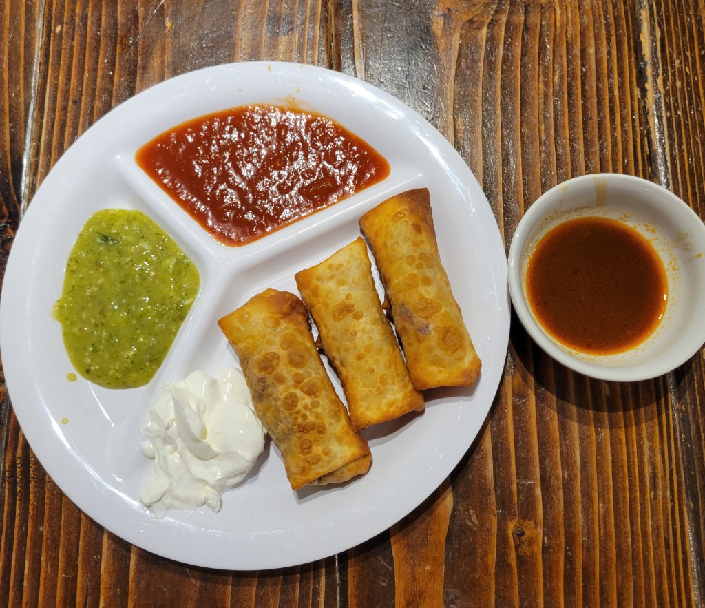 Pulled pork egg rolls with birria, red salsa (slow burn), or salsa verde (avocado cucumber salsa), and/or sour cream for dipping 😋 This was delicious. I used leftover pork from when we used a pork shoulder to make a pork birria; yeah, we made that a thing. I strained the meat, heated pork, and birria, separately. Placed egg roll at angle, placed pork closest to me, sprinkled some diced red onion on top, folded closest point over, folded side ends up, tapped a little egg wash on furthest point and rolled. Then fried until golden and crispy. That worked out REALLY GOOD 👌