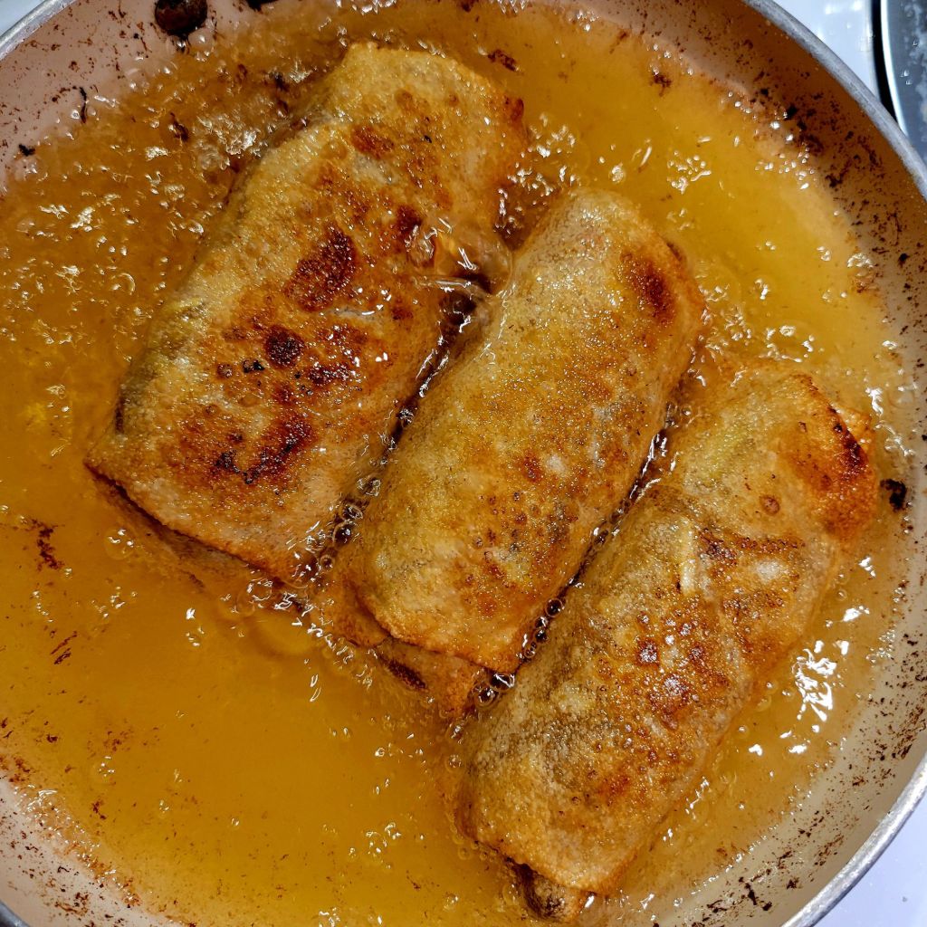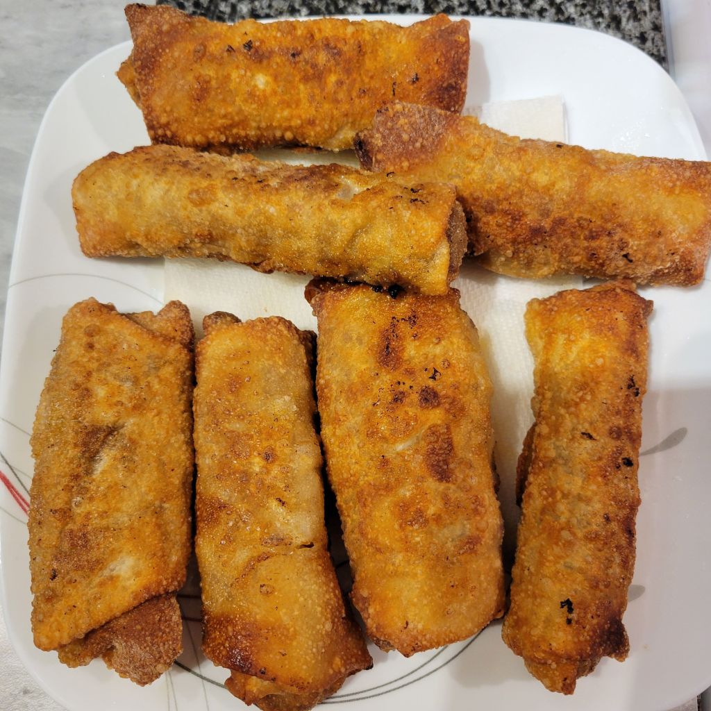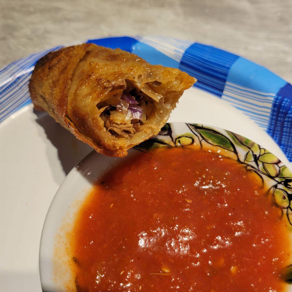 Shredded or pulled pork egg rolls with birria, red salsa (slow burn), or salsa verde (avocado cucumber salsa), and/or sour cream for dipping 😋 This was delicious. I used leftover pork from when we used a pork shoulder to make a pork birria; yeah, we made that a thing. I strained the meat, heated pork, and birria, separately. Placed egg roll at angle, placed pork closest to me, sprinkled some diced red onion on top, folded closest point over, folded side ends up, tapped a little egg wash on furthest point and rolled. Then fried until golden and crispy. That worked out REALLY GOOD 👌