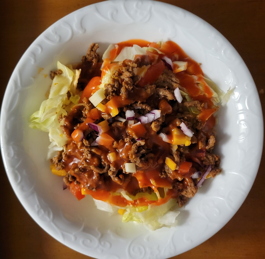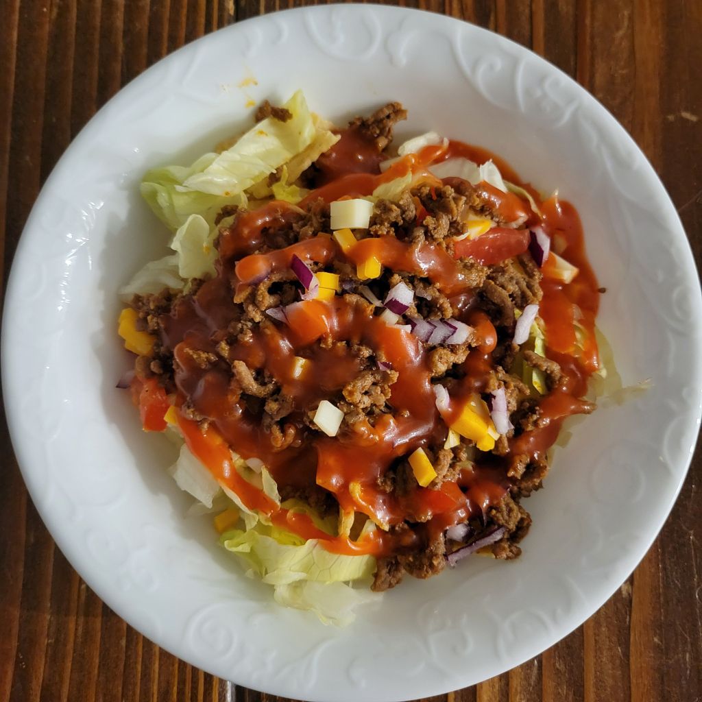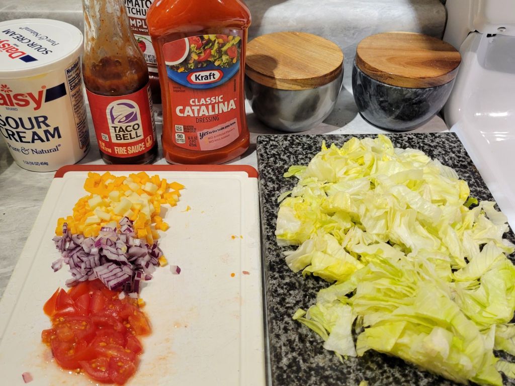 EASY! Yet good. ๐ Recipe not necessary ๐ https://just2note626395589.wordpress.com/2023/12/03/catalina-taco-salad/ โก๏ธย Taco meat – cooked, drained, seasoned ground beef (salt, pepper, garlic powder, onion powder, chili powder, cumin; if you want spicy… add cayenne pepper, crushed red pepper flakes, or hot sauce, all to taste.). Then put together according to your preferences; from ingredients like tortilla chips, lettuce, tomato, cheese, and either roll with the Catalina dressing style or your favorite salsas (my daughter’s, from local farmer’smarket) โคต๏ธ