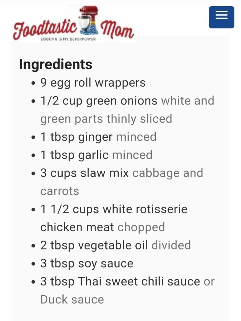 ROUGHLY adapted from the link below. Except, I fried mine in healthy oil; we like egg rolls that way 😜 and we make ours bigger, only because it’s what my daughter and I eat for dinner, not just an appetizer. We loved these! Especially with a sweet chili sauce! 😋 ⤵️